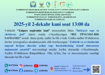 2025-yil 2-dekabr kuni soat 13:00 da 3-dekabr “Xalqaro nogironlar kuni” munosabati bilan “Inklyuziv raqs va cheklovsiz ijod” shiori ostida o‘tkazilayotgan…