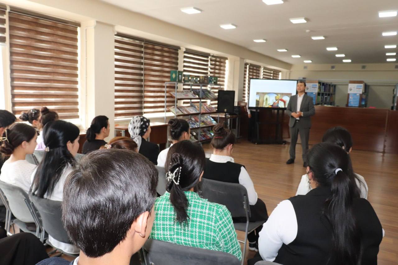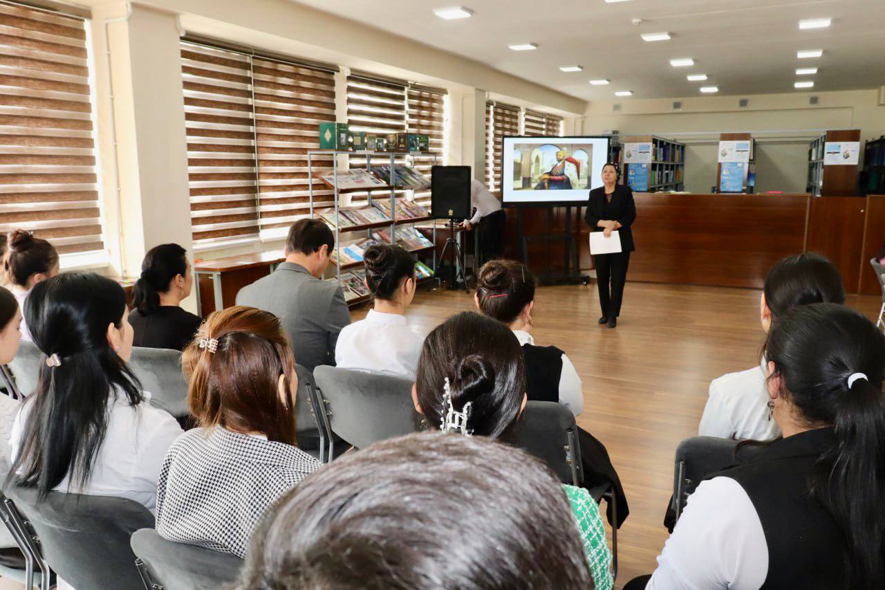 🌺 So’ngra o’zbek tili va adabiyoti kafedrasi mudiri, professor M.Sh. Murodova, buyuk sarkarda, yirik davlat arbobi, kuchli markazlashgan davlat asoschisi, ilm-fan va madaniyat homiysi, Oʻrta Osiyo tarixining keyingi rivojiga katta taʼsir koʻrsatgan tug‘ma diplomat va nozik siyosatchi Amir Temur bobomizning hayoti haqida mehmonlar va talabalarga ko’rgazmali ma’lumotlar berdilar.