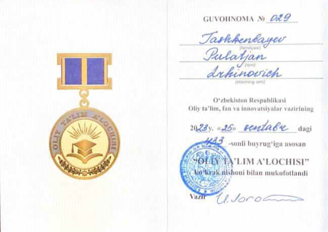 O’zbekiston davlat xoreografiya akademiyasi San’at nazariyasi va tarixi kafedrasi dotsenti, san’atshunoslik fanlari nomzodi Tashkenbayev Pulatjon Irkinovichni davlatimiz tomonidan berilgan yuksak mukofot “OLIY TA’LIM A’LOCHISI” ko’krak nishoni bilan barcha akademiya jamoasi chin dildan tabriklaydi.