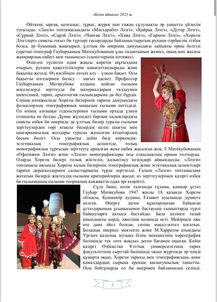 Maqola O‘zbekiston davlat xoreografiya akademiyasi Urganch filiali professori, O‘zbekiston xalq artisti, “Mehnat shuhrati” va “El-yurt hurmati” ordenlari sovrindori, Qozog‘iston Respublikasi “Do‘stlik” medali sohibasi Gavhar Matyoqubovaning ilmiy-pedagogik faoliyatiga bag’ishlangan.