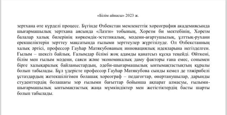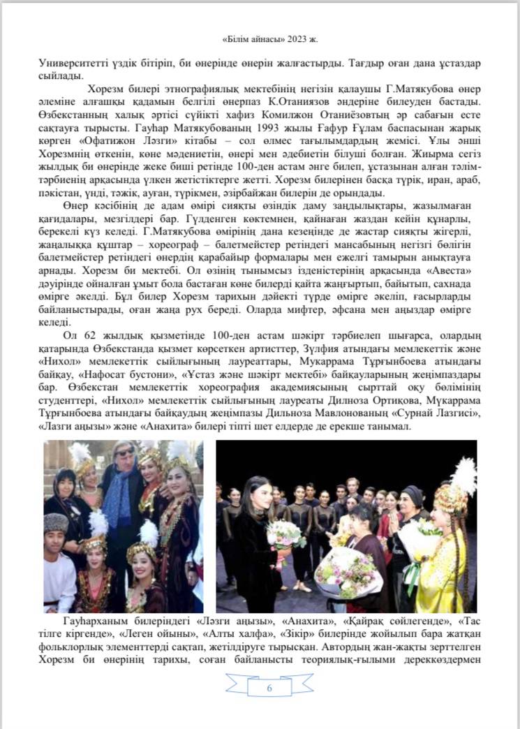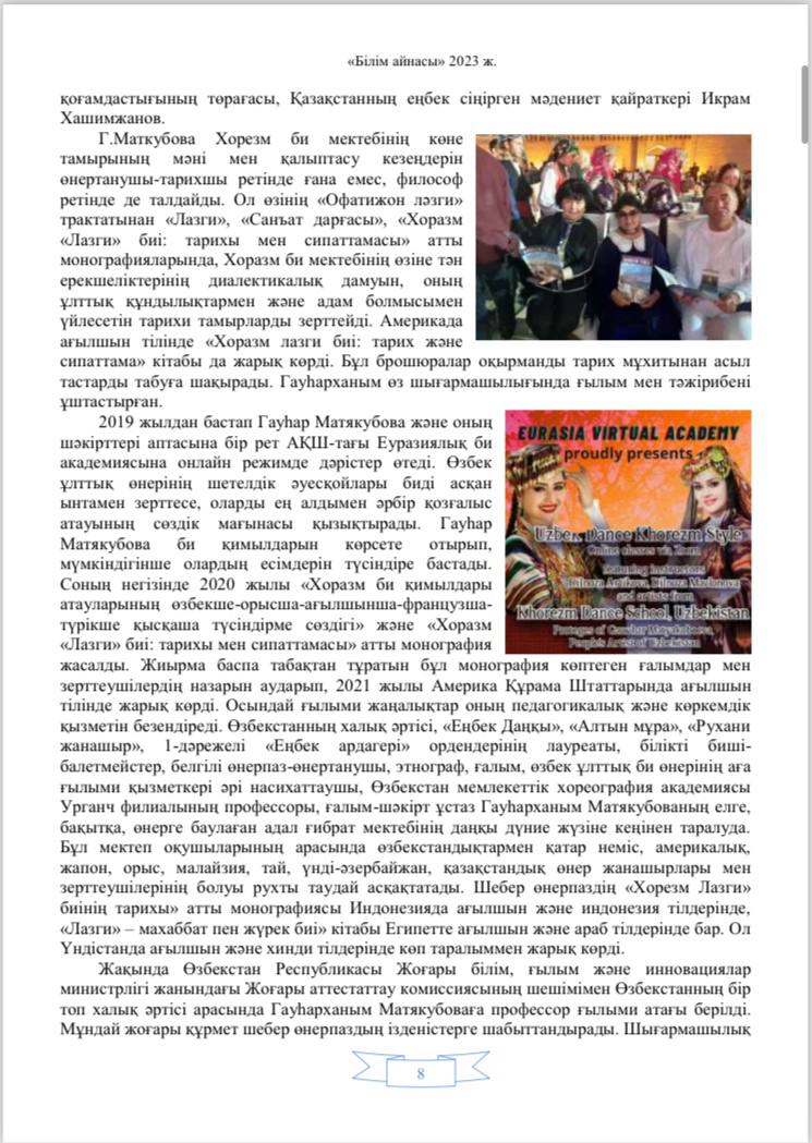 Qozog‘iston Respublikasining “Bilim oynasi” («Білім айнасы») jurnalida O’zbekiston davlat xoreografiya akademiyasi rektori Sh.Toxtasimov, Filologiya fanlari doctori, dotsent H.Hamroyeva hamda Qozog‘iston Respublikasi Jumabek Tashenov nomidagi universitet dotsenti, Pedagogika fanlari bo’yicha falsafa doktori Sh.Naraliyevalarning “O’ZBEK RAQS SAN’ATI GAVHARI” (“ӚЗБЕК БИ ӚНЕРІ ГАУҺАРЫ”) nomli maqolasi chop etildi.