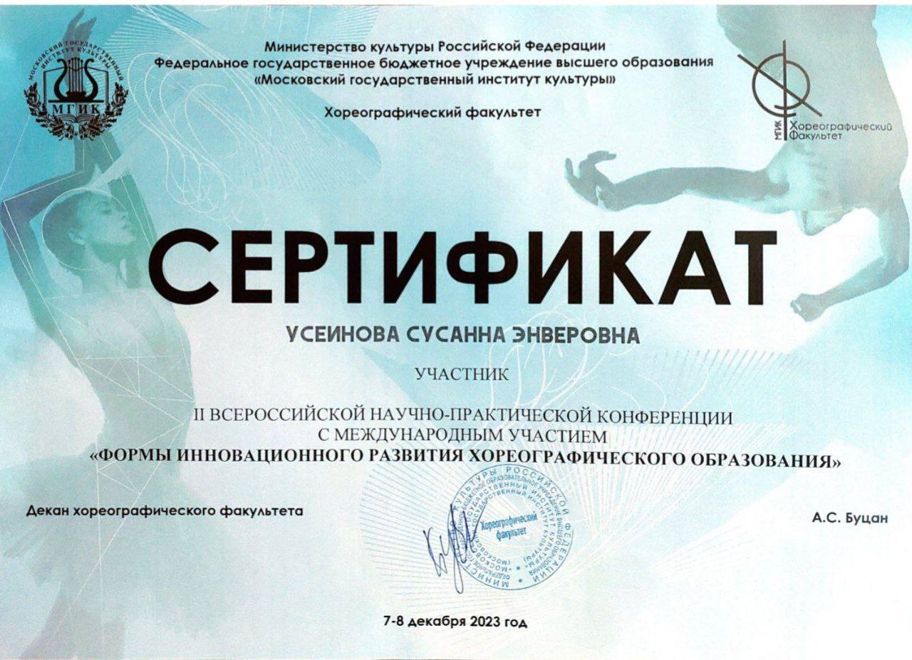 Joriy yilning 7-8-dekabr kunlari O’zbekiston davlat xoreografiya akademiyasi “Xoreografiya jamolari rahbari” kafedrasi o‘qituvchisi Useinova Susanna Enverovna Rossiya Federatsiyasining Moskva davlat madaniyat institutida bo‘lib o‘tgan, “Xoreografiya ta’limini innovatsion rivojlantirish shakllari” mavzusida II Butunrossiya ilmiy-amaliy xalqaro konferensiyada ishtirok etib, nutq so’zladi.