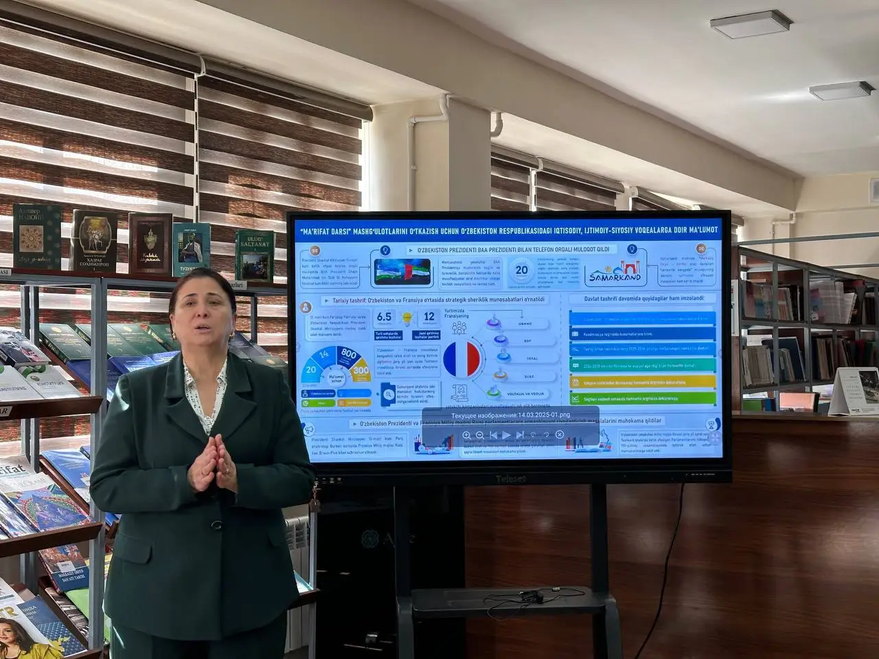 Mashg’ulot О‘zbekiston Respublikasi Prezidentining Fransiyaga rasmiy tashrifi va О‘zbekiston-Fransiya о‘rtasida tuzilgan hamkorlik aloqalari hamda joriy yilning 10-15-mart sanalarida mamlakatimizda rо‘y bergan iqtisodiy, ijtimoiy-siyosiy voqealarga bag‘ishlandi.