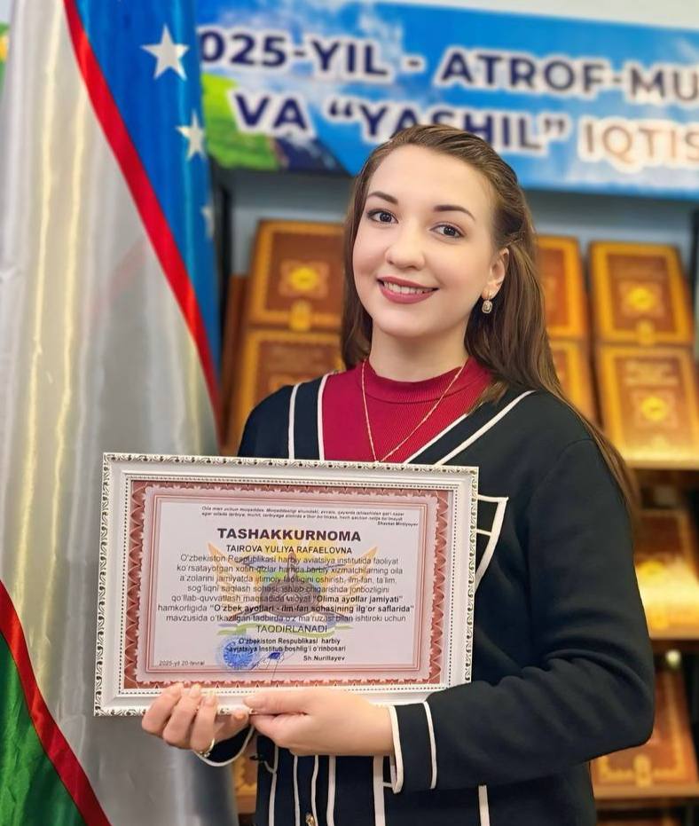 Kuni kecha, 24-mart kuni Qashqadaryo viloyati “Olima ayollar jamiyati” ayollarni ijtimoiy faolligini oshirish, ularning ilm-fan, ta’lim, sog‘liqni saqlash va ishlab chiqarish sohalarida о‘z imkoniyatlarini namoyon etishga yо‘naltirish maqsadida tashkil etilgan “О‘zbek ayollari – ilm-fan sohasining ilg‘or saflarida” nomli tadbir tashkil etildi. Mazkur tadbirda О‘zbekiston davlat xoreografiya akademiyasi 1-kurs tayanch doktoranti Tairova Yuliya о‘z ma’ruzasi bilan ishtirok etdi va tashkilotchilarning tashakkurnomasi bilan taqdirlandi.