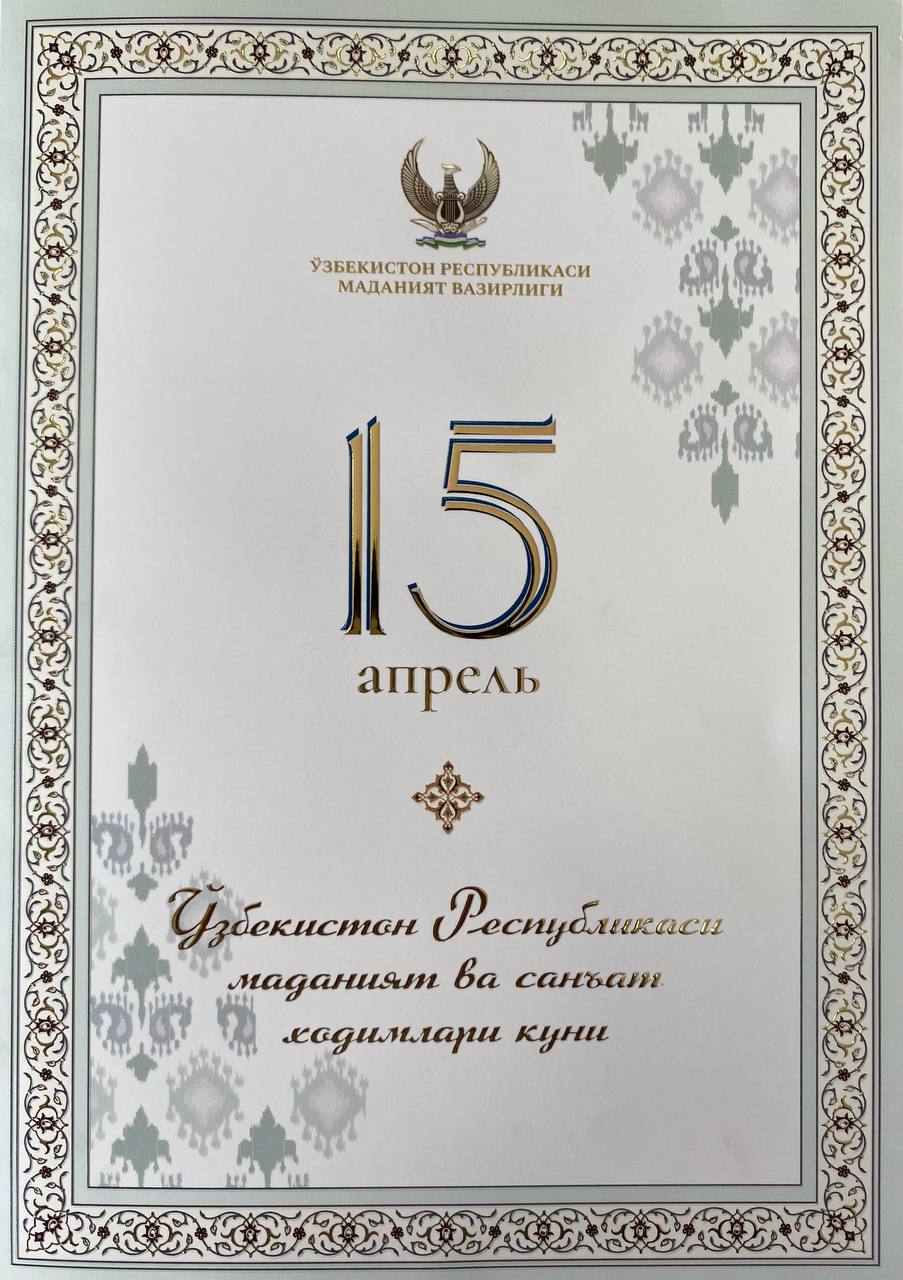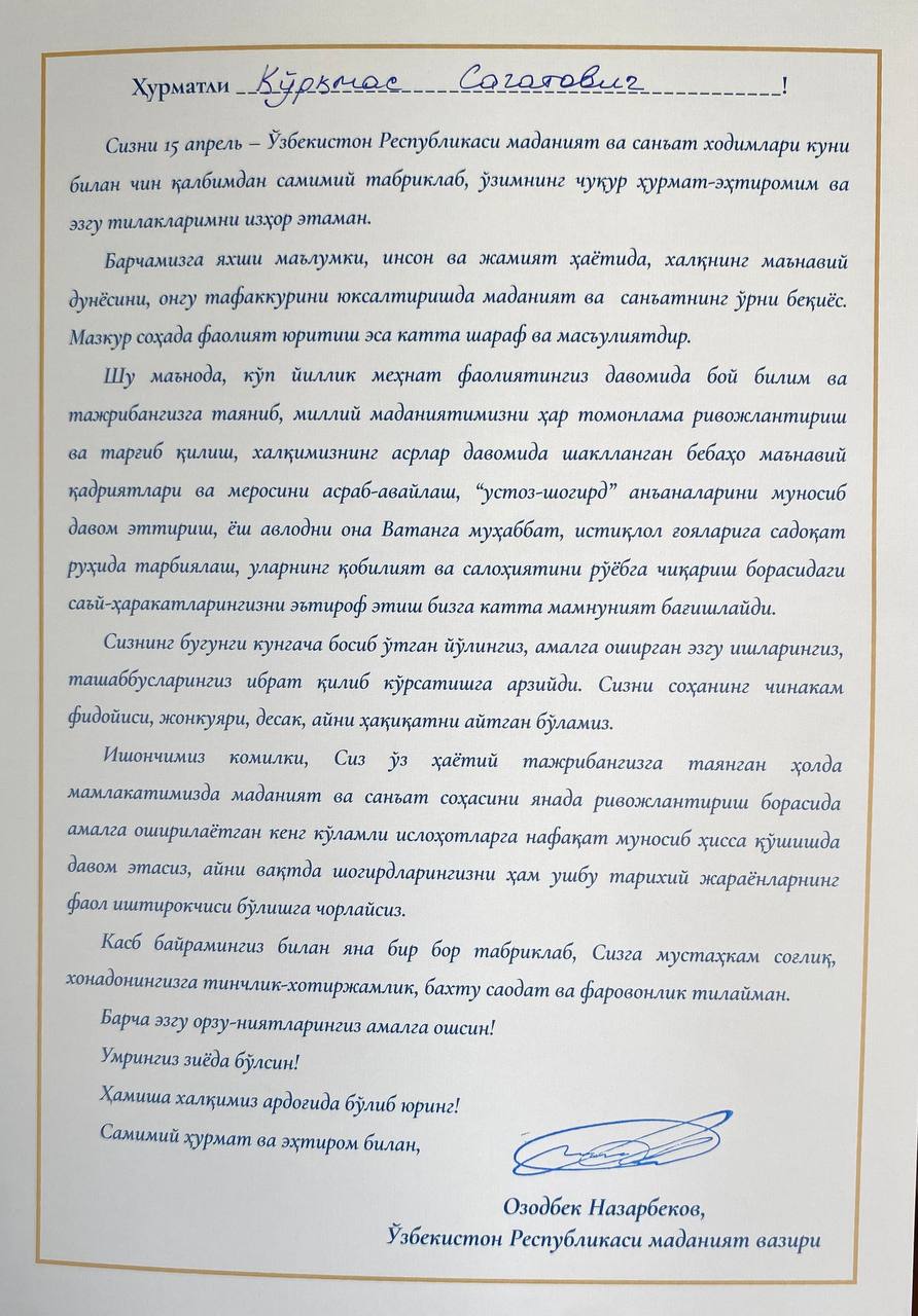 ”15-aprel — O‘zbekiston Respublikasi madaniyat va san’at xodimlari kuni” munosabati bilan O’zbekiston Respublikasi Madaniyat vaziri Ozodbek Nazarbekov madaniyat faxriylari: O’zbekiston xalq artisti Mavayeva Gulnora Nizamovna va Qoraqalpog‘iston Respublikasi xalq artisti, O‘zbekiston Respublikasida xizmat ko‘rsatgan san’at arbobi, O‘zDXA professori Sagatov Qo‘rqmas Sag‘atovichlarni kasb bayramlari bilan qutladi!