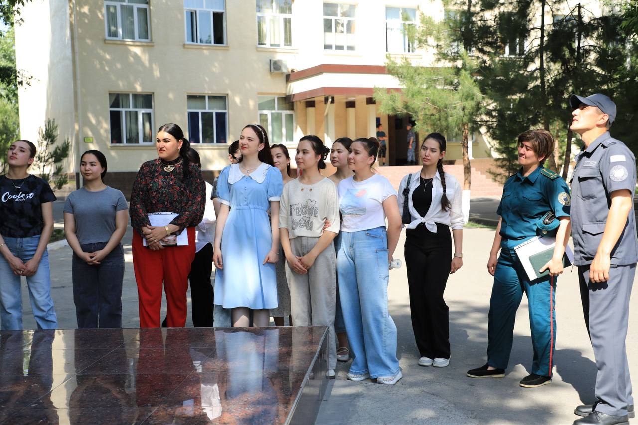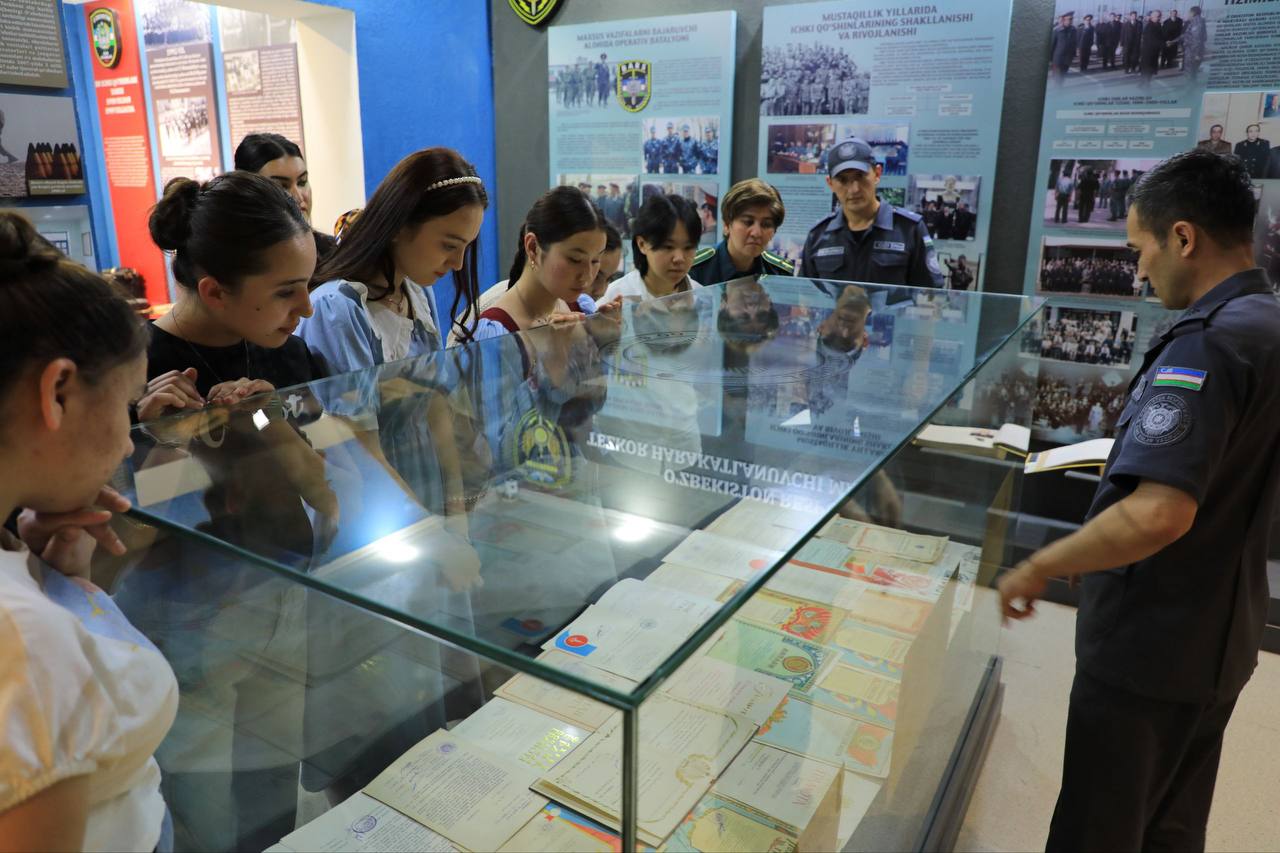 Batalyon komandirining tarbiyaviy va mafkuraviy ishlar bo‘yicha o‘rinbosari mayor A.B..Yesemuratov talaba-yoshlarga qismda joylashgan Amir Temur haykali, saf maydoni, navbatchilik qismi va muzey bilan tanishtirdi.