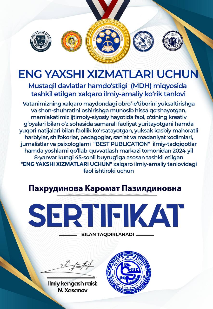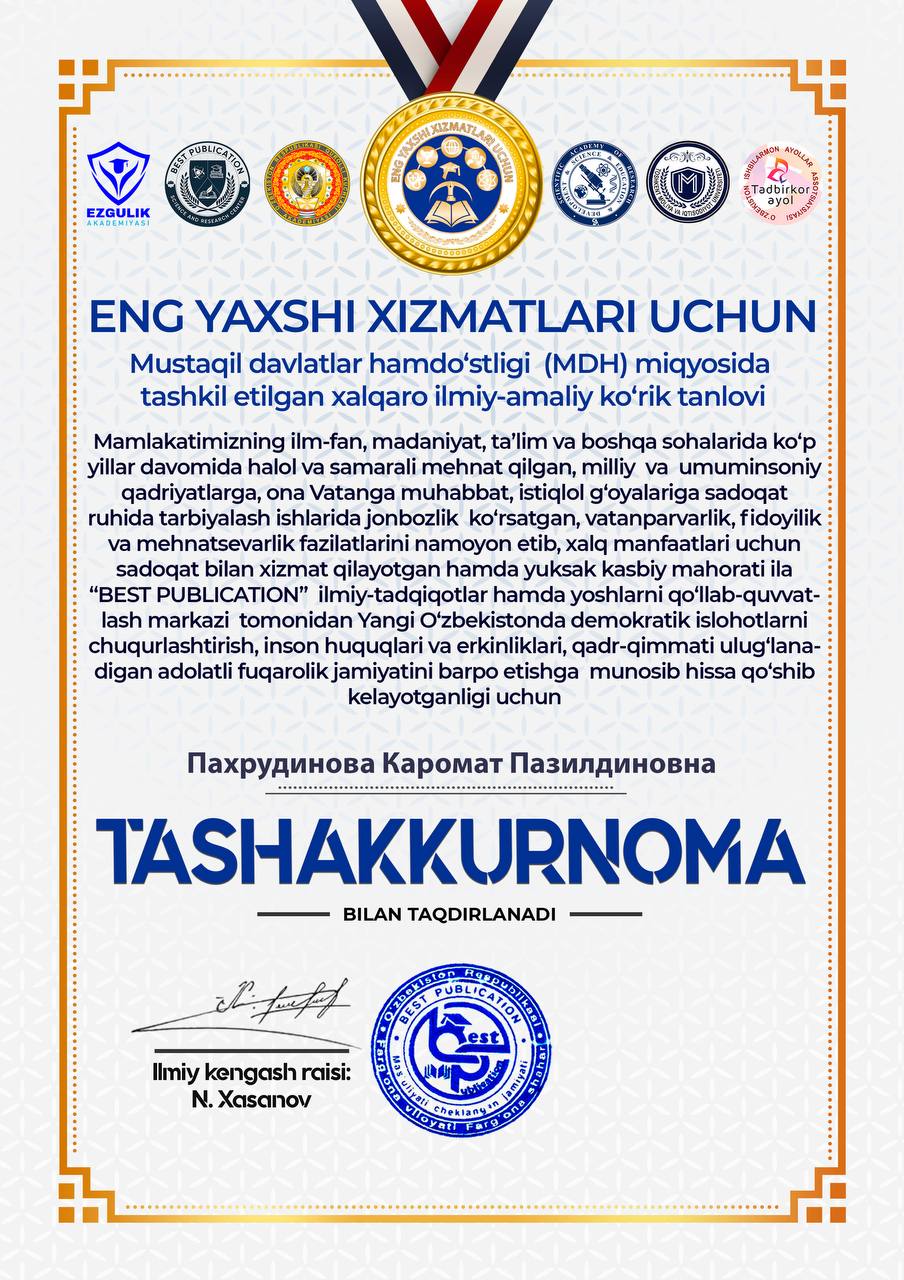 О‘zbekiston davlat xoreografiya akademiyasi 1-kurs tayanch doktoranti Karomat Paxrudinova Mustaqil davlatlar hamdo’stligi (MDH) miqyosida tashkil etilgan xalqaro ilmiy-amaliy ko’rik tanlovi doirasida tashkil etilgan, “ENG YAXSHI XIZMATLARI UCHUN” xalqaro ilmiy-amaliy tanlovida “О‘zbek milliy raqs san’ati” nomli ilmiy maqolasi bilan ishtirok etib, tanlovning maxsus kо‘krak nishoni, sertifikat va tashakkurnomasi bilan taqdirlandi.