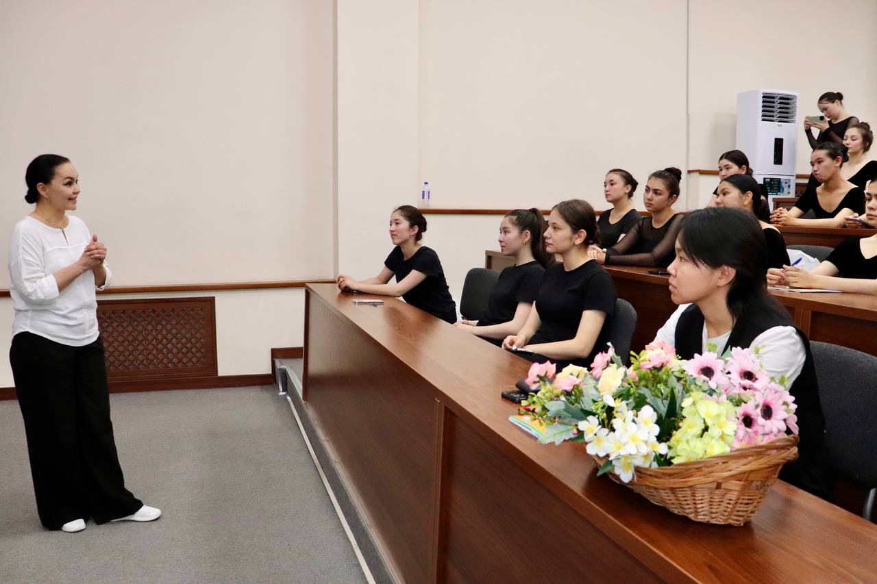 U talaba qizlarga pedagog-xoreograf va raqqosa sifatida mustahkam oila qurish, ayni vaqtda o‘z ijodiy faoliyatini davom ettirish uchun nimalarga e’tibor qaratish lozimligi haqida so‘zlab berdi hamda o‘zining hayotiy tajribasi va ko‘p yillik ijodiy faoliyatiga tayanib, qizlarga foydali tavsiyalarni berdi.