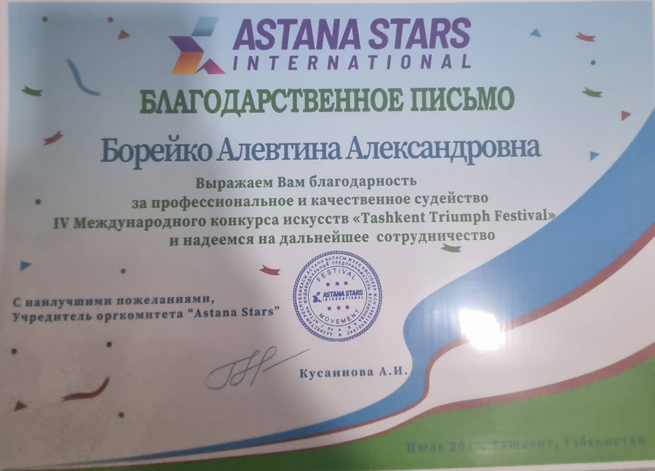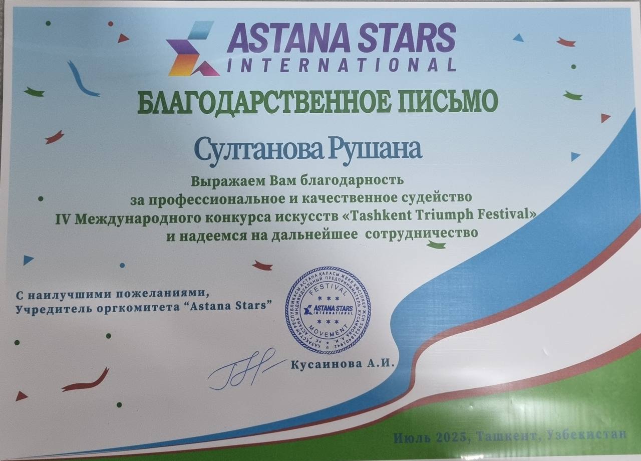Bugun, 27-iyul kuni O’zbekiston davlat xoreografiya akademiyasi Yoshlar masalalari va ma’naviy-ma’rifiy ishlar bo’yicha birinchi prorektori, O’zbekiston xalq artisti Sultanova Rushana hamda “Xoreografiya pedagogikasi” kafedrasi o’qituvchisi Boreyko Alevtina hakamlar O‘zbekiston davlat konservatoriyasida bo’lib o’tgan “Astana stars International” tomonidan tashkil qilingan “Tashkent Triumph Festival” IV Xalqaro san’at tanlovida hay’at a’zosi sifatida ishtirok etib, tashakkurnoma bilan taqdirlandilar.
