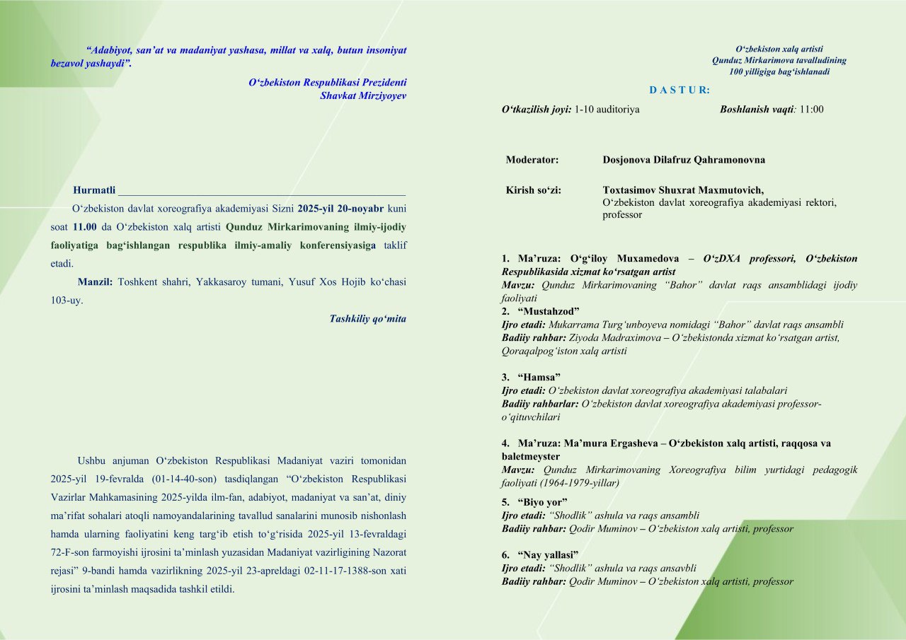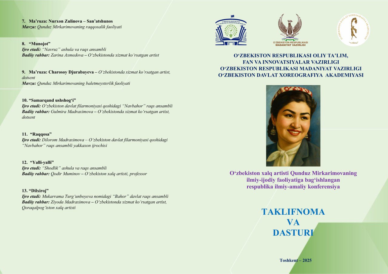 О‘zbekiston Respublikasi Madaniyat vaziri tomonidan 2025-yil 19-fevralda (01-14-40-son) tasdiqlangan “О‘zbekiston Respublikasi Vazirlar Mahkamasining 2025-yilda ilm-fan, adabiyot, madaniyat va san’at, diniy ma’rifat sohalari atoqli namoyandalarining tavallud sanalarini munosib nishonlash hamda ularning faoliyatini keng targ‘ib etish tо‘g‘risida 2025-yil 13-fevraldagi 72-F-son farmoyishi ijrosini ta’minlash yuzasidan Madaniyat vazirligining Nazorat rejasi” 9-bandi hamda vazirlikning 2025-yil 23-apreldagi tegishli xati ijrosini ta’minlash maqsadida, О‘zbekiston davlat xoreografiya akademiyasida 2025-yilning 19-noyabr kuni soat 11.00 da О‘zbekiston xalq artisti Qunduz Mirkarimovaning ilmiy-ijodiy faoliyatiga bag‘ishlangan respublika ilmiy-amaliy konferensiyasi bо‘lib o’tadi.