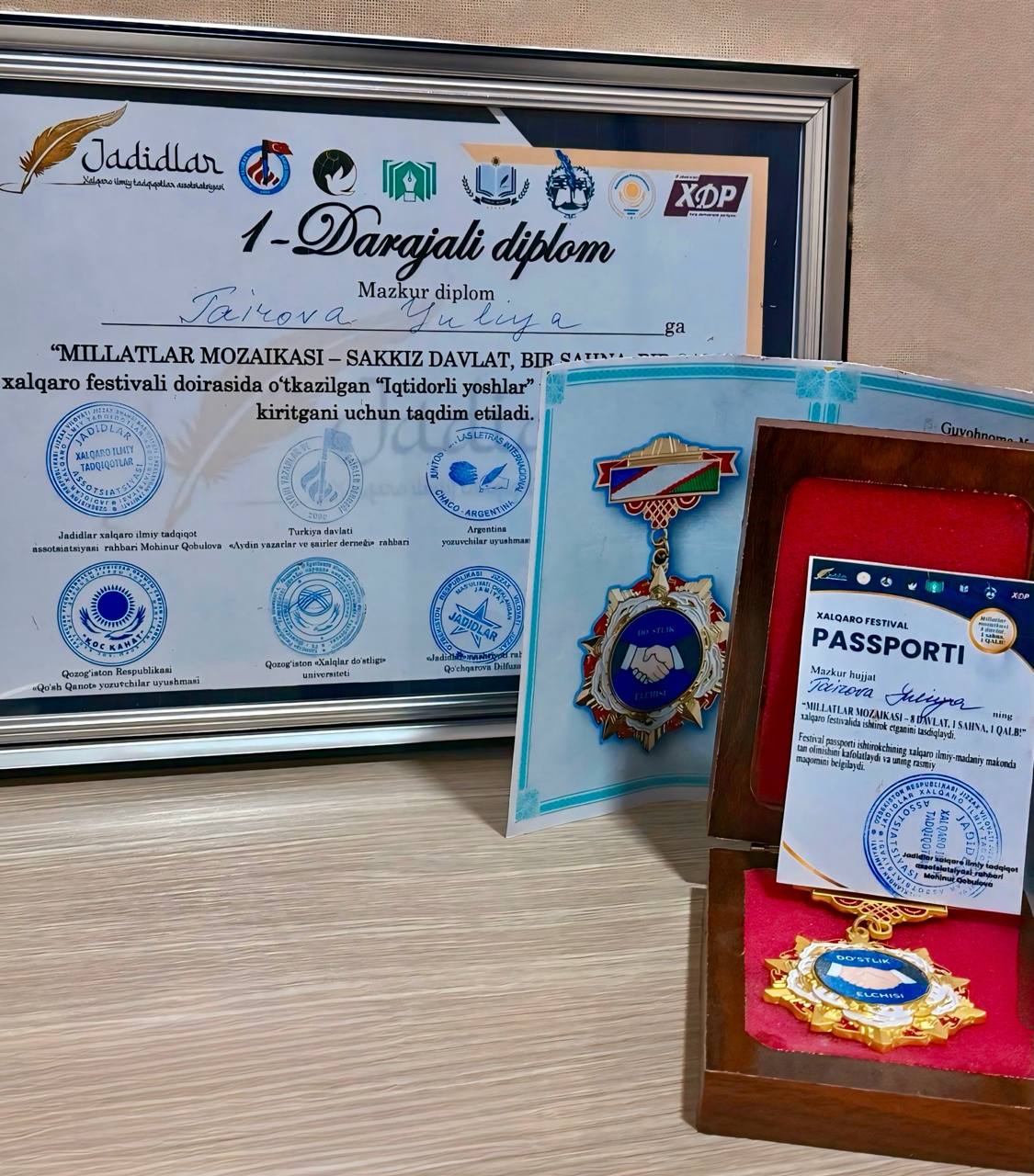 O‘zbekiston davlat xoreografiya akademiyasi 1-bosqich tayanch doktoranti Yuliya Toirova “Jadidlar” xalqaro ilmiy-tadqiqot assotsiatsiyasi hamda Turkiya, Argentina, Rossiya va Qozog‘istonning nufuzli ijodiy va ilmiy tashkilotlari hamkorligida o‘tkazilgan “Millatlar mozaikasi — Sakkiz davlat, bir sahna, bir qalb!” xalqaro festivalida munosib ishtirok etdi.