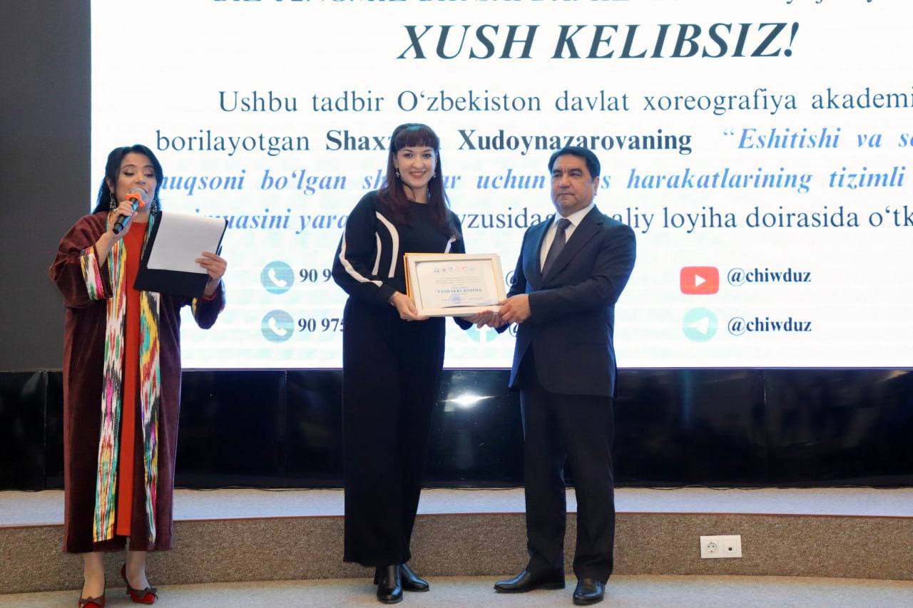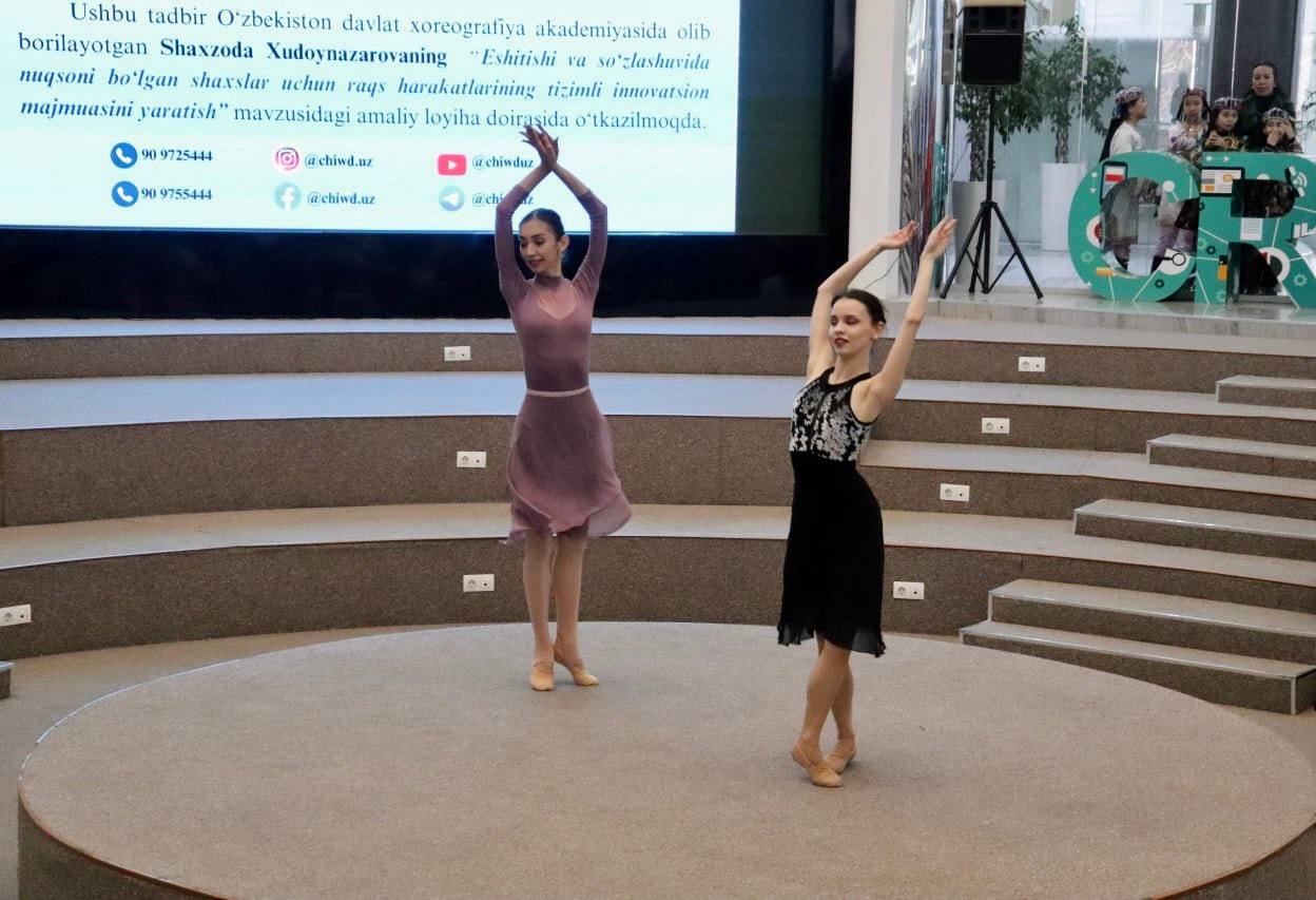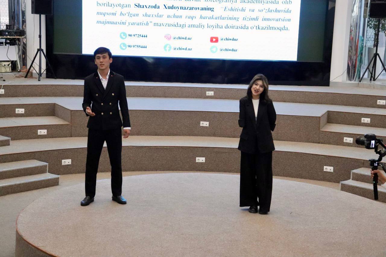Tadbir akademiyada, pedagogika fanlari bo’yicha falsafa doktori (PhD) Shaxzoda Xudoynazarova rahbarligida olib borilayotgan “Eshitishida va so’zlashuvida nuqsoni bo’lgan shaxslar uchun raqs harakatlarining tizimli innovatsion majmuasini yaratish” mavzisidagi amaliy loyiha doirasida o’tkazildi.