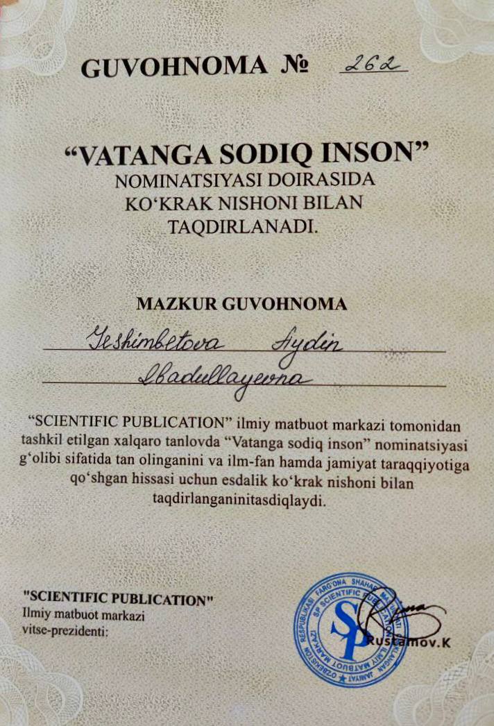 Mustaqil Davlatlar Hamdo’stligi (MDH) miqyosida birinchi marotaba “Scientific Publication” ilmiy matbuot markazi tomonidan tashkil etilgan xalqaro ilmiy ishlar tanlovida ilm-fan hamda jamiyat taraqqiyotiga qo‘shgan munosib hissasi uchun O’zbekiston davlat xoreografiya akademiyasi “Xoreografiya pedagogikasi” kafedrasi dotsenti Yeshimbetova Aydin Ibadullayevna “Vatanga sodiq inson” nominatsiyasi g‘olibi sifatida e’tirof etilib, esdalik ko‘krak nishoni bilan taqdirlandi.