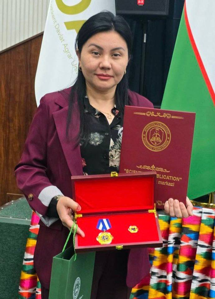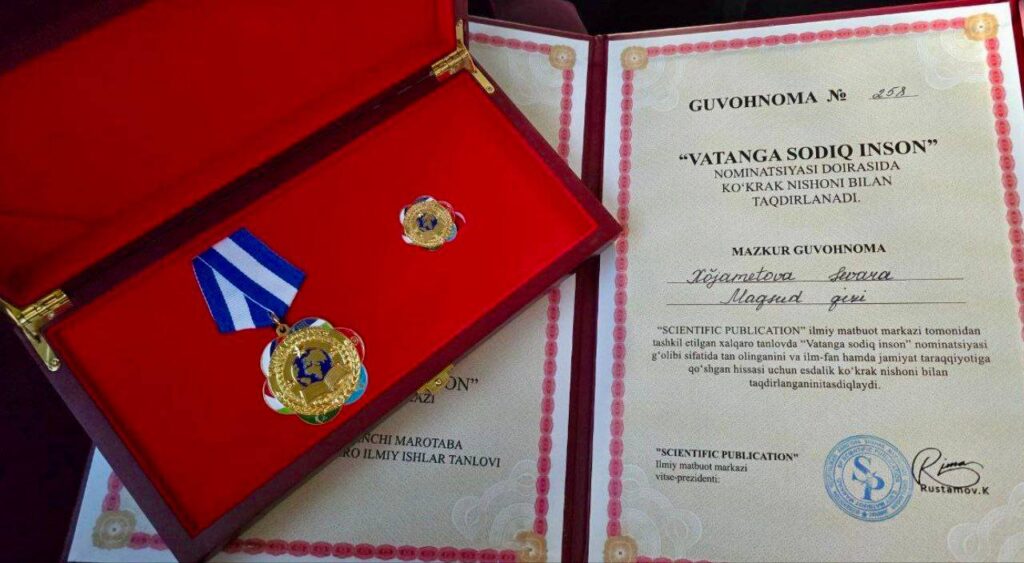 Aademiya mustaqil izlanuvchisi Xoʻjametova Sevara Maqsud qizi “Vatanga sodiq inson” nominatsiyasi doirasida esdalik ko‘krak nishoni bilan taqdirlandi