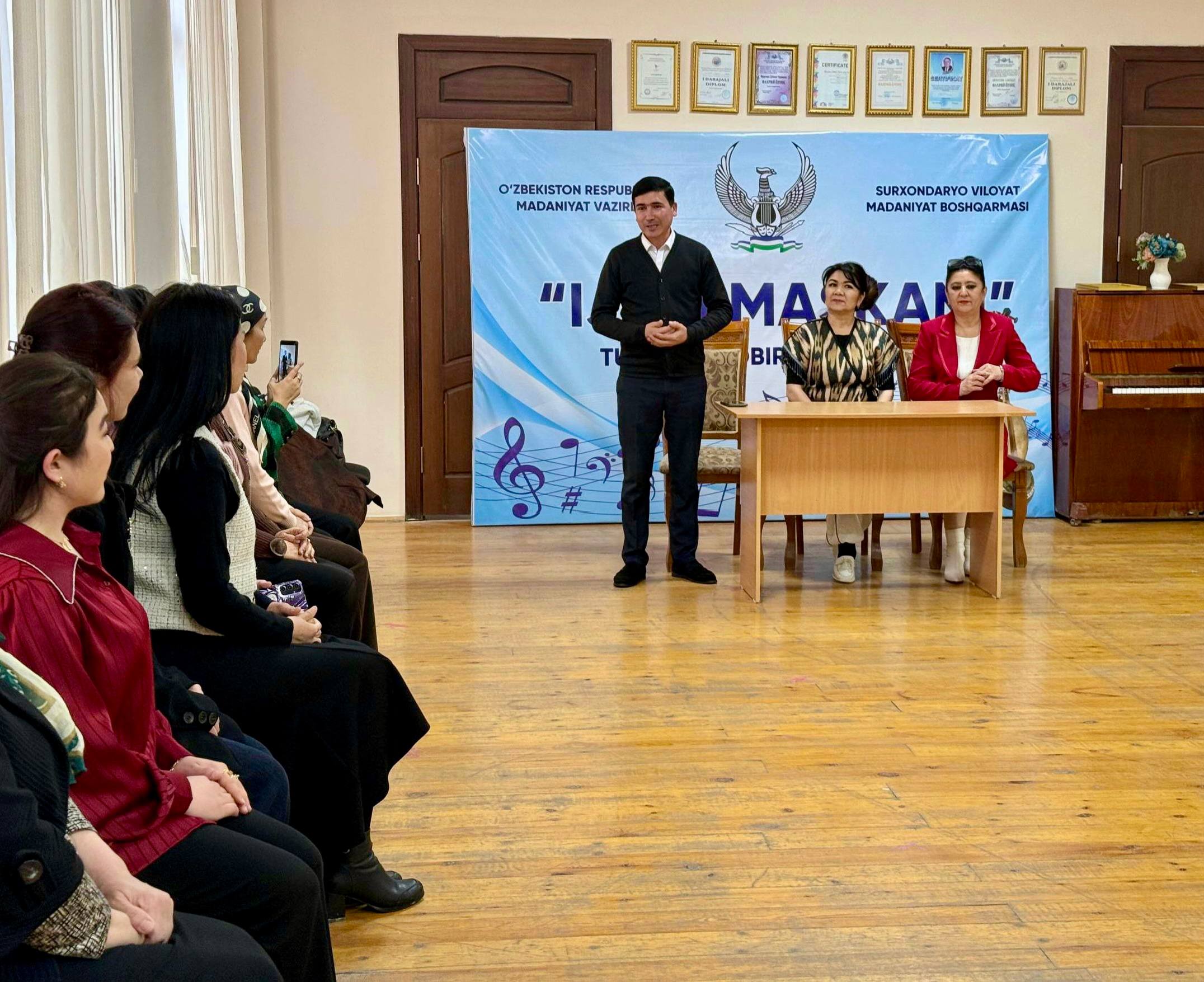 O‘zbekiston Respublikasi Madaniyat vazirining 2025-yil 26-sentyabrdagi “Ijod maskani” turkum tadbirlari hamda “Mahorat darslari”ni o‘tkazish to‘g‘risidagi 456-sonli buyrug‘i ijrosini ta’minlash maqsadida joriy yilning 6-mart kuni Termiz shahridagi 1-son Bolalar musiqa va san’at maktabida “Mahorat darsi” tashkil etildi.