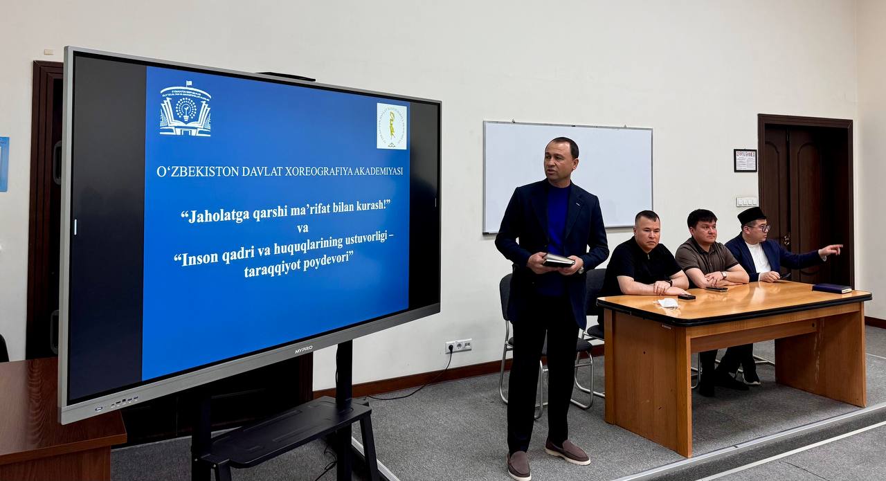 Bugun O‘zbekiston davlat xoreografiya akademiyasida yoshlarni turli yot g‘oyalar ta’siridan asrash, ularning ma’naviy immunitetini mustahkamlash hamda sog‘lom ijtimoiy-ma’naviy muhitni shakllantirish maqsadida “Jaholatga qarshi ma’rifat bilan kurash!” hamda “Inson qadri va huquqlarining ustuvorligi – taraqqiyot poydevori” mavzularida muhim ma’naviy-ma’rifiy tadbir tashkil etildi.