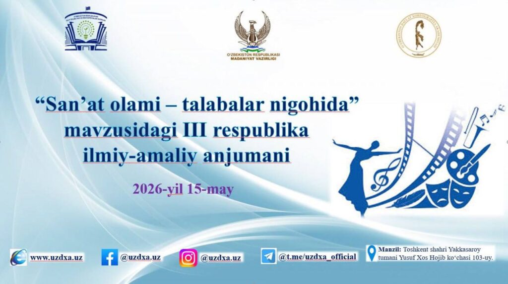 Talaba-yoshlarni ilmiy-tadqiqot ishlariga keng jalb etish, intellektual salohiyatini oshirish va ularning ilmiy-ijodiy faoliyatini rag‘batlantirish hamda ilg‘or tajribalardan keng foydalanish, ilm-fanni muntazam isloh qilib borishning ustuvor yо‘nalishlarini belgilash, zamonaviy bilimga ega va mustaqil fikrlaydigan yuqori malakali kadrlar tayyorlash, shu bilan birga iste’dodli yoshlarni respublikaning nufuzli ta’lim tashkilotlari talabalari bilan tajriba almashishini tashkil etish maqsadida, О‘zbekiston davlat xoreografiya akademiyasida 2026-yil 15-may kuni “San’at olami– talabalar nigohida” mavzusida III respublika talabalar ilmiy-amaliy anjumani (https://uzdxa.uz/23200/) о‘tkaziladi.