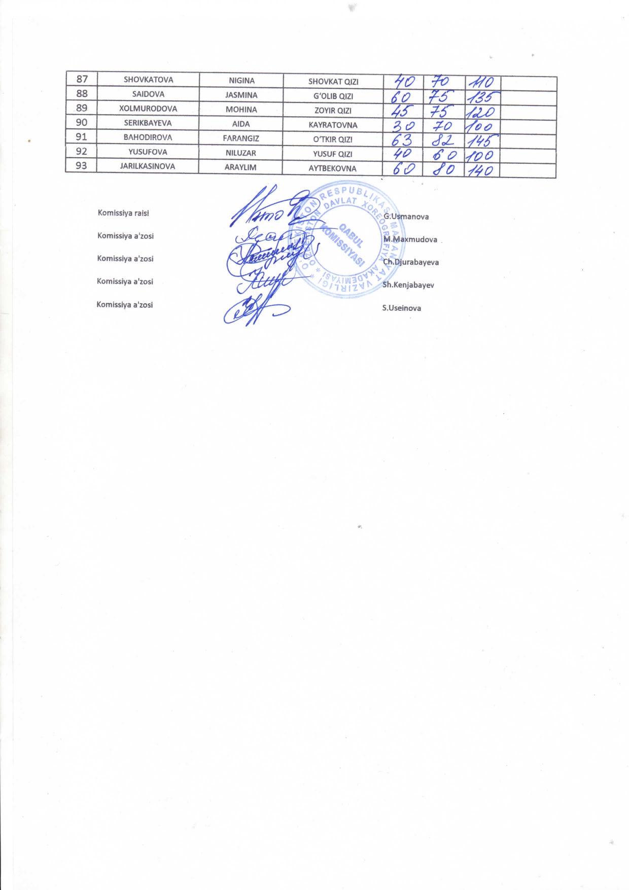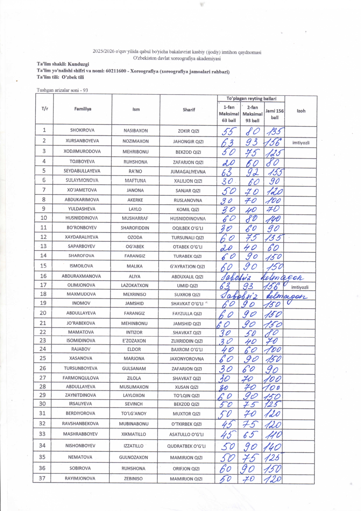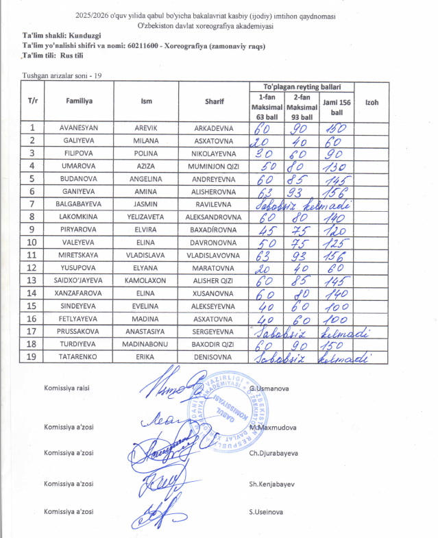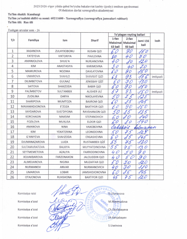 2025-2026 о‘quv yili qabuli jarayonida O’ZBEKISTON DAVLAT XOREOGRAFIYA AKADEMIYASIDA о‘tkazilgan kasbiy (ijodiy) imtihonlarning