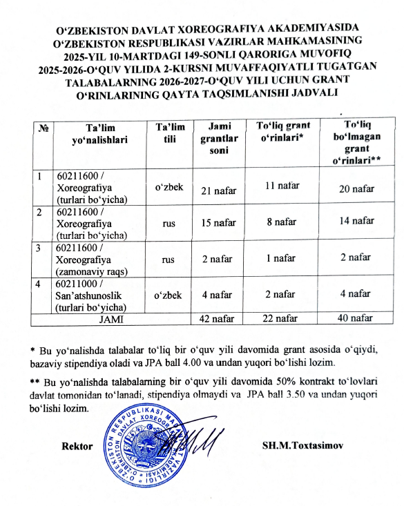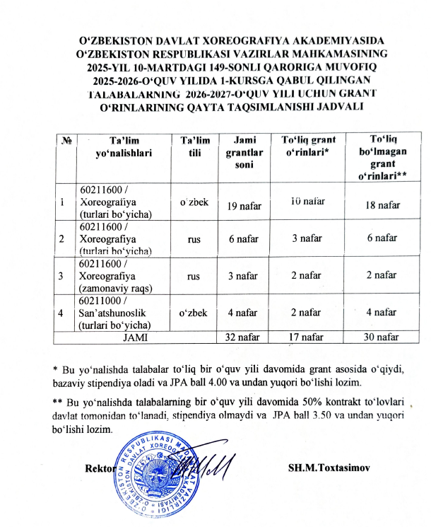 О‘zbekiston davlat xoreografiya akademiyasi O‘zbekiston Respublikasi Vazirlar Mahkamasining “Oliy ta’lim tashkilotlarida talabalarga grantlarni taqdim etish va qayta taqsimlash tartibi to‘g‘risida”gi nizomni tasdiqlash haqida 2025-yil 10-martdagi 149-sonli qarori hamda O‘zbekiston Respublikasi Oliy ta’lim, fan va innovatsiyalar vazirligining 2025-yil 25-martdagi 117-son buyrug‘i asosida 2026-2027-о‘quv yilida 1- va 2-kurslar uchun grant о‘rinlari qayta taqsimlanishi jadvalini e’lon qilmoqda.